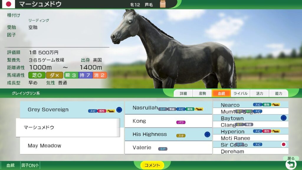 大種牡馬が4頭(グレイソヴリン、ナスルーラ、ネアルコ、ハイペリオン)と、初期馬としては十分な血統構成で、