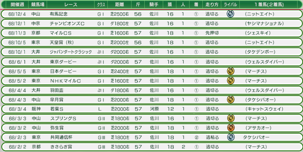 | 68 | 5 | 5 | 東京 | 日本ダービー | G I | 芝2400m 左 | 佐川 | 勝つにはリセット駆使。 |