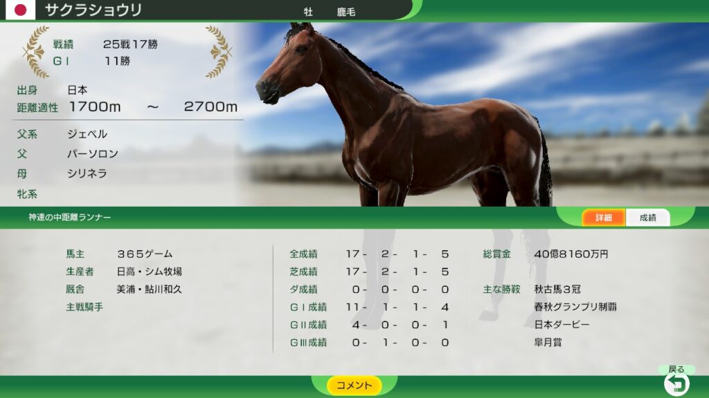 ◎ | サクラショウリ | 銀 | 牡 | パーソロン | シリネラ | 70 | 60 | 65 | ◎ | × | 早熟鍋 | 持続 | 大舞台 強心臓 |