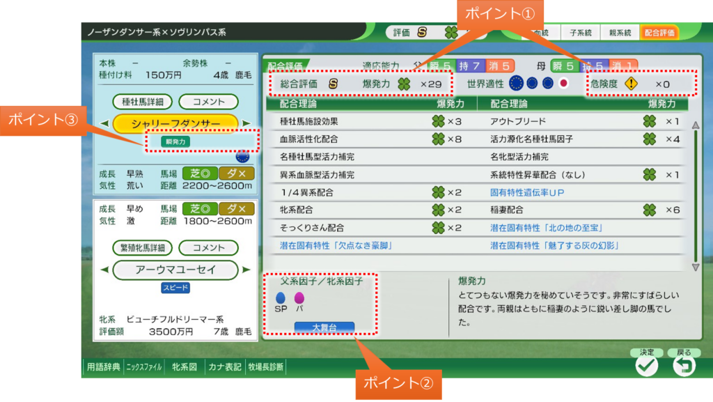 危険度は0の馬を選ぶようにして、『総合評価、爆発力ともに申し分ない』配合のときのみ3まで許容すると良いでしょう。