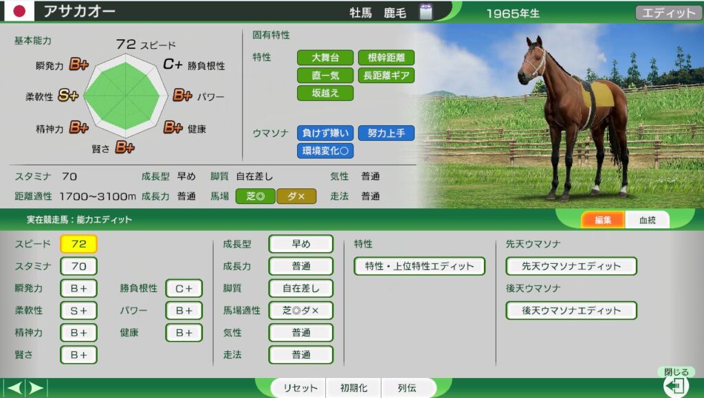 後述するアサカオーの能力アップに比べると見劣りするが、距離適性が広がり、使い勝手は良くなっただろう。