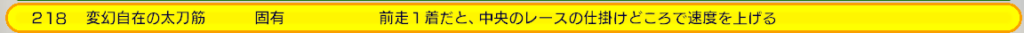 予想した固有特性で万能性UPは入らず、「前走1着だと、中央のレースの仕掛けどころで速度を上げる」という何とも言えない能力。国内は無敵だろうから、中央限定では少しものたりない。
