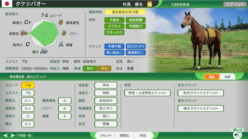 WP10 2025に収録されている、種牡馬としてのタケシバオーよりも、盛られたステータスになるはずだ。