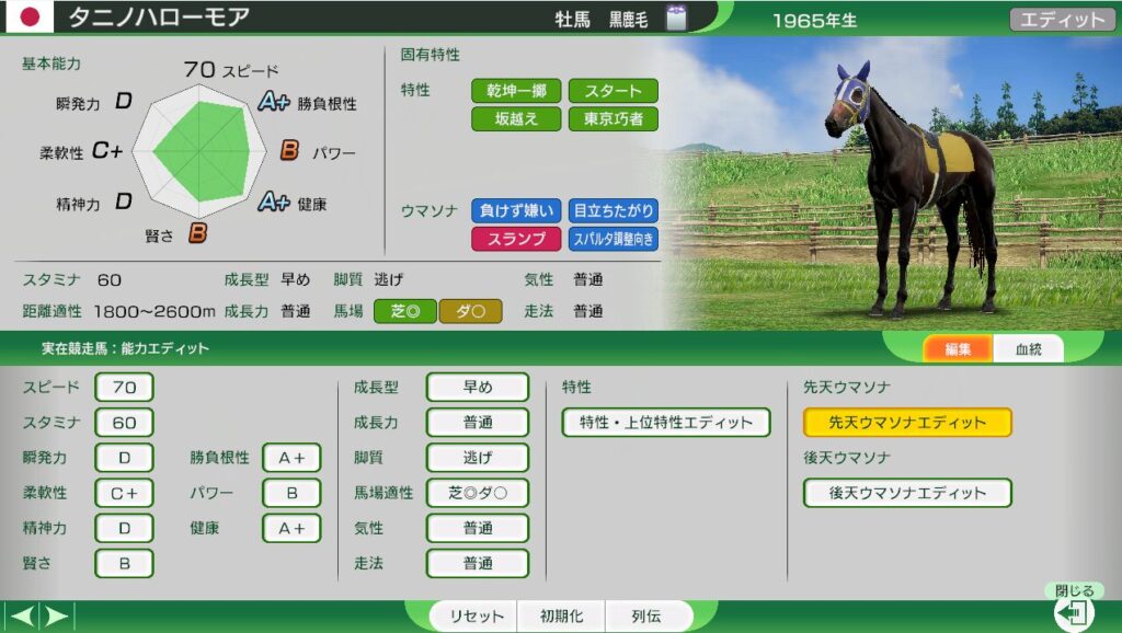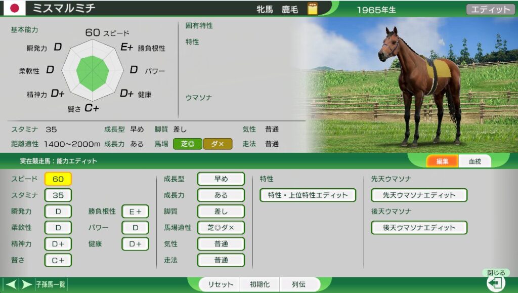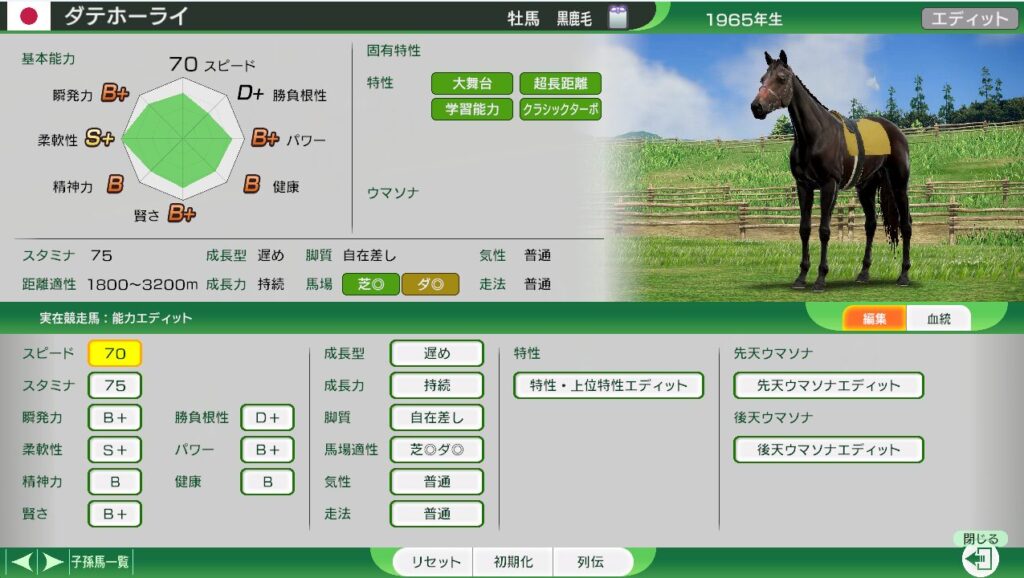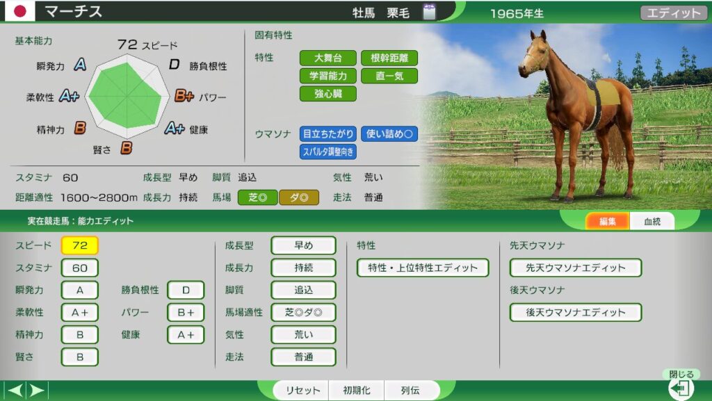 - 【解説】: 芝・ダート問わず、短距離から3200mまでこなした元祖「怪物」。史実ではクラシックを惜敗したが、古馬になってから手がつけられない強さを発揮した。
