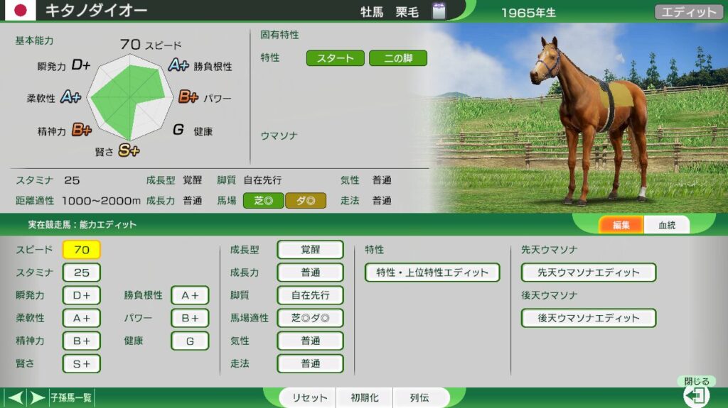 | キタノダイオー (幻の三冠馬) | 覚醒 / 虚弱 / 芝ダート◎ | 2歳時に3戦3勝→ケガ 3歳時に3戦3勝→ケガ 4歳時に1戦1勝→ケガ(引退) トータル7戦7勝で引退。 | 2025の種牡馬としての収録は、SP71、健康G、成長型「覚醒」。 IF世界線が楽しめる一頭 |
