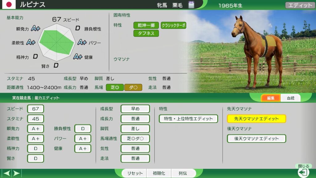 | ルピナス (タフネスクイーン) | 早め / タフネス | 通算成績35戦7勝、主な勝ち鞍はオークス。 | 牝馬三冠級の能力。サブパラも申し分ない。 |