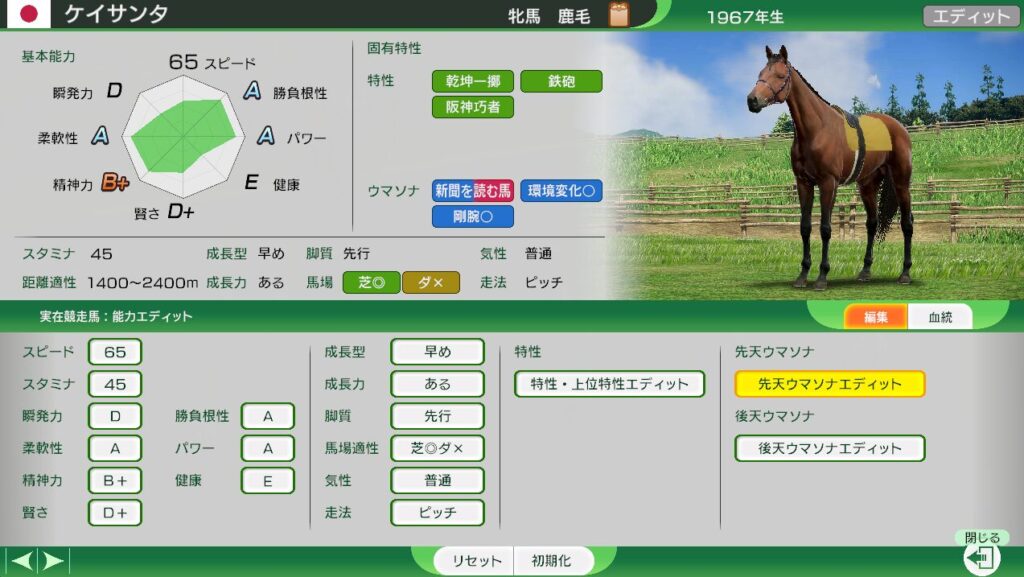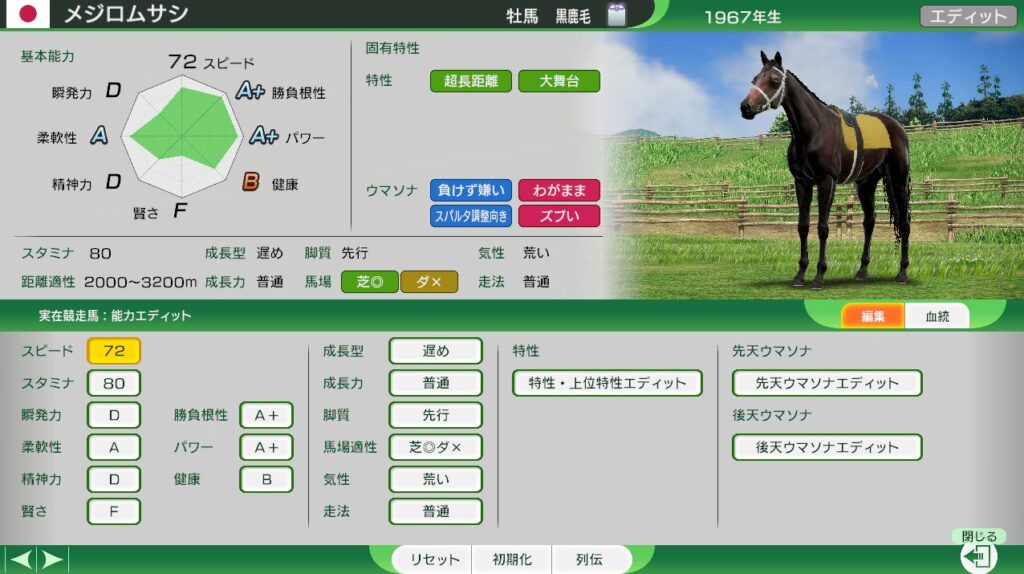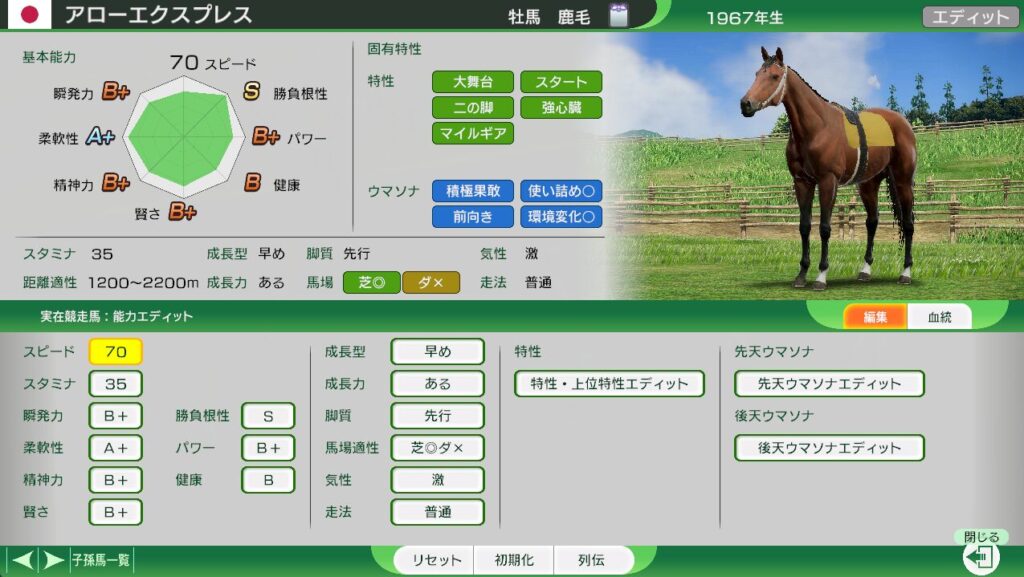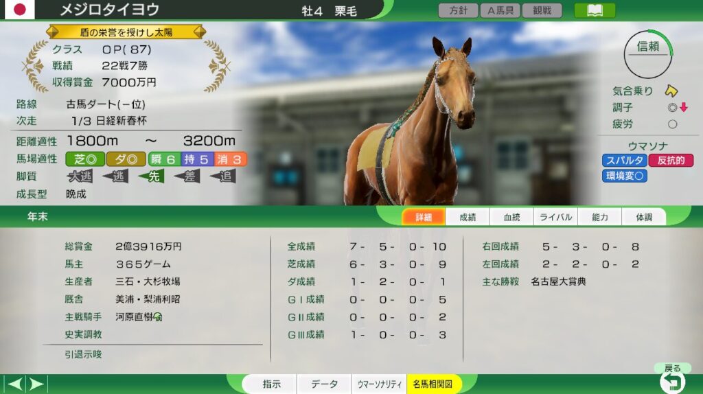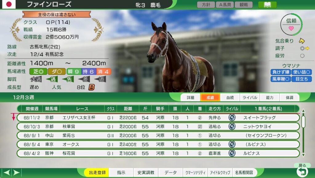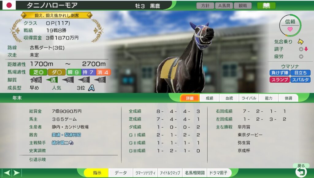 距離適性が広く、三冠路線を勝ち負けできる。(難易度EASYでは、牝馬三冠もできる見込みあり。)