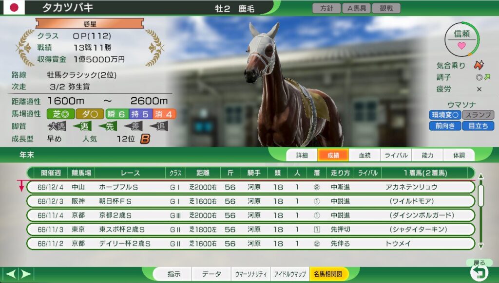 初見プレイでは2歳で13戦11勝で朝日杯FSに勝利。
