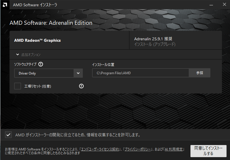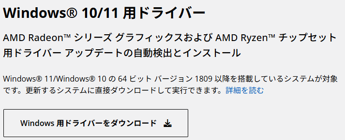 - AMD Radeonドライバ 公式ページ からダウンロード