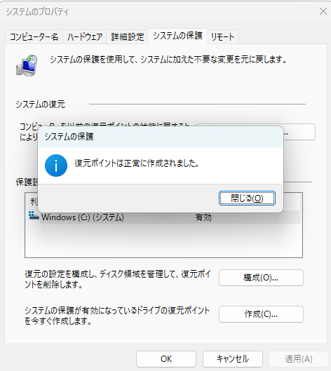 1. スタートメニュー検索 → 「復元ポイントの作成」