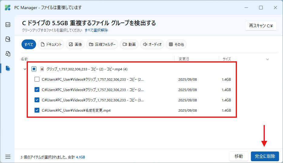 PCマネージャーは、重複ファイルを自動で検出し削除してくれるため、ストレージの無駄遣いを防げます。